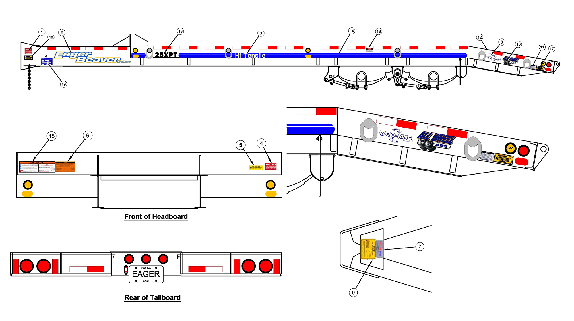 White Striping Kit is for Red, Blue and Black 25XPT model trailers. The kit includes blue striping, red and white DOT conspicuity striping, model numbers, and all safety decals: